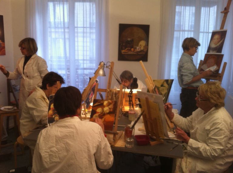 On apprend d’abord les bases de la peinture à l’ancienne, celle qui inclut la lumière et travaille avec des couleurs transparentes. Le rôle du fond comme miroir, les grisailles pour la mise en place du dessin, puis la mise en couleurs. Les règles pour obtenir LA bonne couleur, oubliez le dentifrice qui sort des tubes !